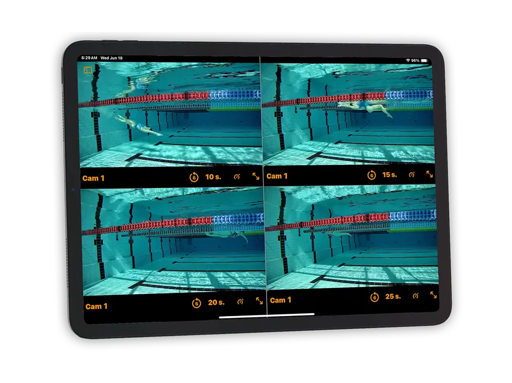 Instead of stopping to record and replay, the 4-split delay shows the same sequence four times in succession. Coaches and swimmers can review movements instantly, saving time and improving feedback on the spot.